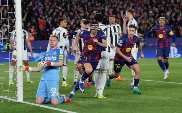6 mins Crucial slips by both Malick Thiaw and Lewis Hall - a possible consequence of the heavy pre-match watering of the pitch - left Raphina to side-foot past Ramsdale in the sixth minute. allowed Lamine Yamal and Fermín Lopez to advance on the Newcastle goal and Raphina to provide a routine side-footed finish. 0-1